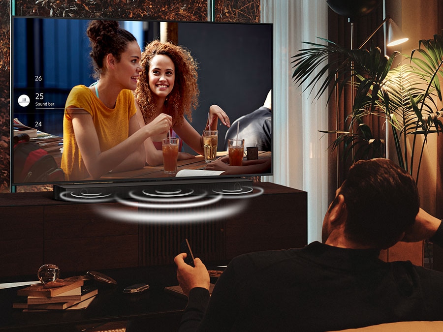* This feature is supported on 2022-2023 Samsung TVs and selected game consoles connected via HDMI. Compatibility subject to change. Sound effects may vary depending on source content and environmental characteristics (including ceiling).